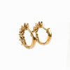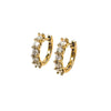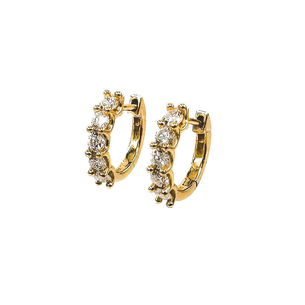 Sterling silver yellow gold plated hinged huggie hoop earrings set with 3mm round Moissanite. A beautiful pop of sparkle with the durability of a 9.5 out of 10 Mohs hardness lab created gemstone. Gold plating applied over sterling silver make these a perfect alternative to expensive solig gold huggie style earrings. Approximately 1.01 carat total weight D color stones with a VVS1 clarity. Approximately 12.5mm hanging length.