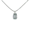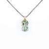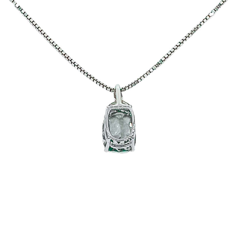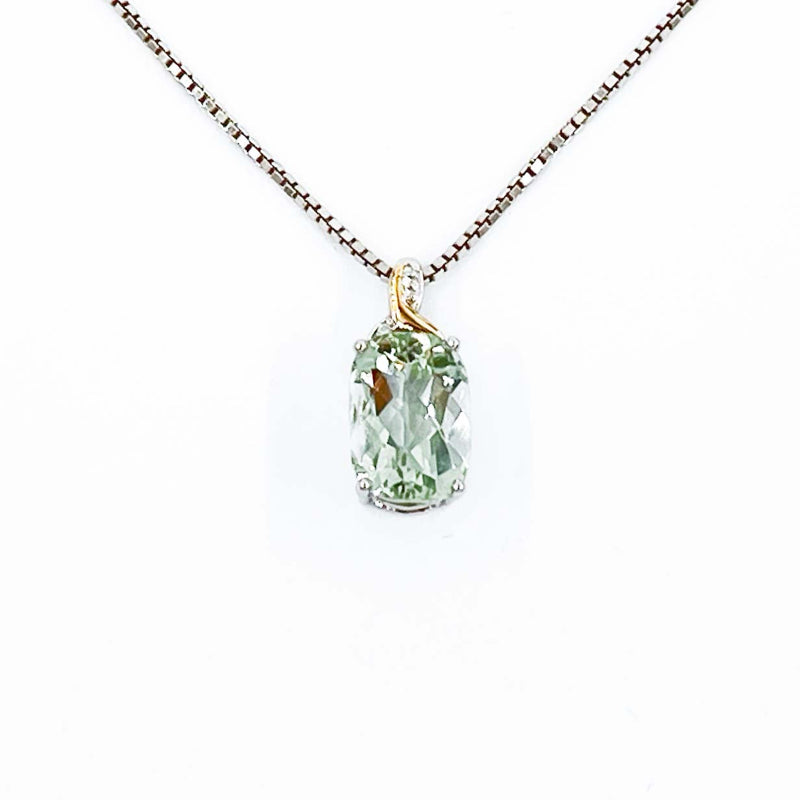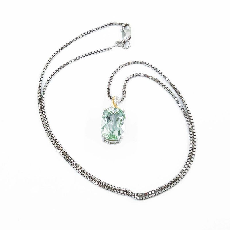 .925 Sterling Silver rhodium plated pendant set with elongated green quartz gemstone along with a diamond and gold accented bail. Displayed from an 18' rhodium plated 1.4mm box chain with lobster clasp closure. Subtle flash of green set off by the gold and diamond accented bail make this a timeless classic. Enjoy the natural radiance of this colorful necklace. Pendant hanging length approx. 22mm