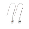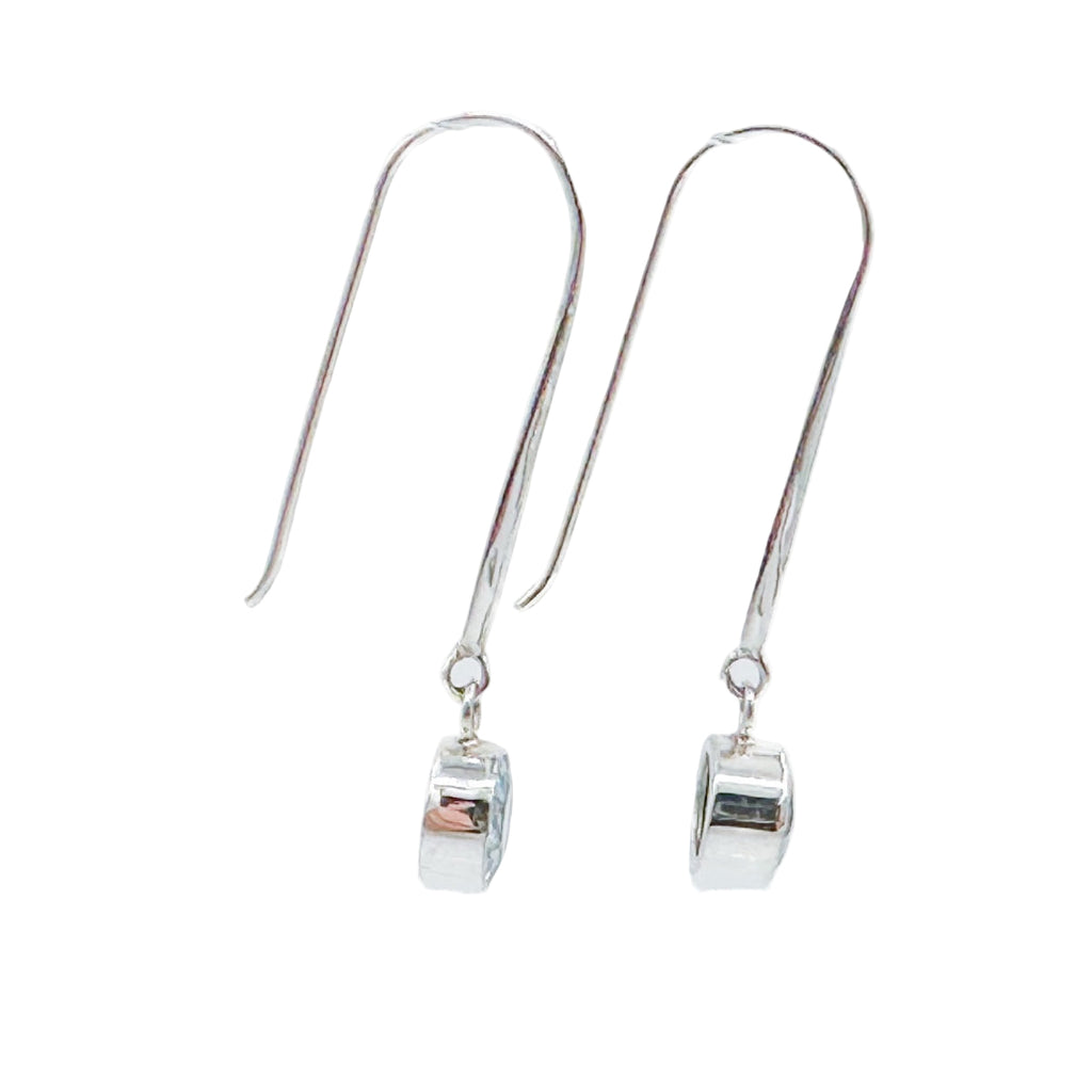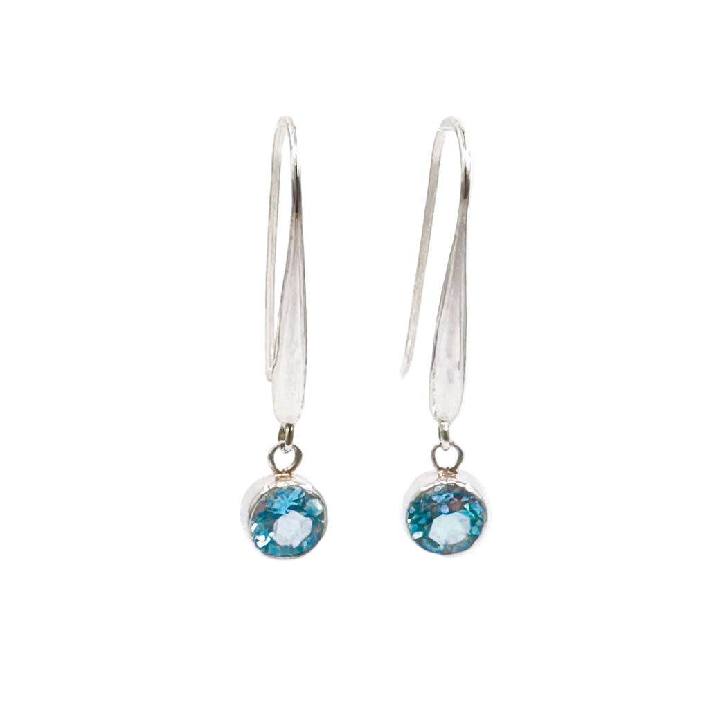 .925 Sterling Silver round bezel set wiht blue topaz hung from a long taper cast sterling silver ear wire. elongating this ear wire not only gives a touch of elegance and custom feel but allows for a more vivid flash of the stone. Beautiful flash of sky blue to accent any outfit or occassion. Approximate hanging length 40mm.
