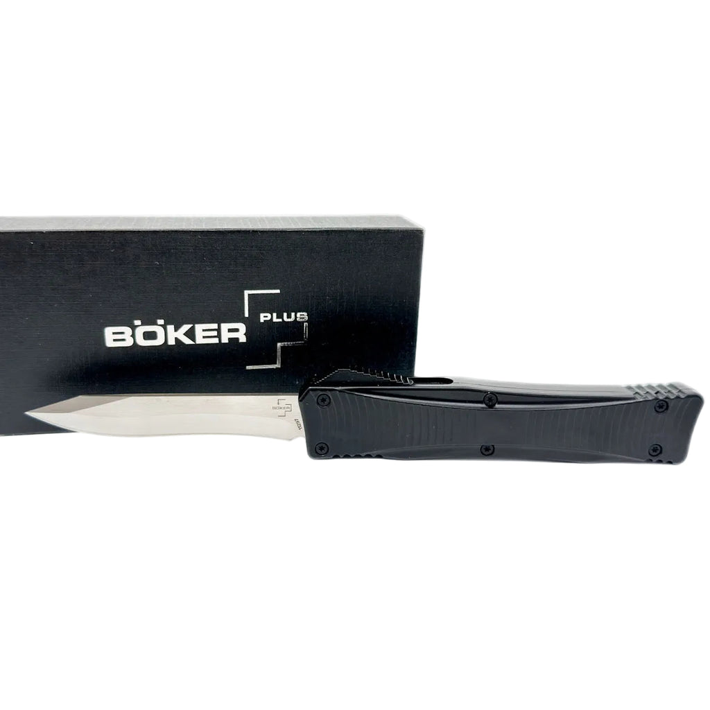 The Boker Plus Falcon OTF, designed by Raimund Lhotak, fits in the hand thanks to the structuring of the titanium-coated handle and the ergonomic design. The reliable mechanism opens and closes the blade by spring force via the release slide, ensuring quick operation. The stunning dynamic grind lines and two-tone finish also make the knife an exquisite collectible. With reverse tanto blade made of D2.  State and Federal Laws apply to purchase - MUST BE 18 YRS OLD TO PURCHASE.  Blade: 3.35" Reverse Tanto Blade - Weight 3.4oz - Handle Length 4.9" - Overall Length 8.27".